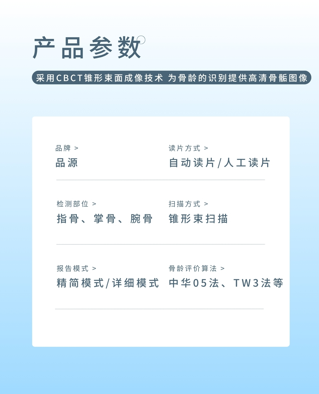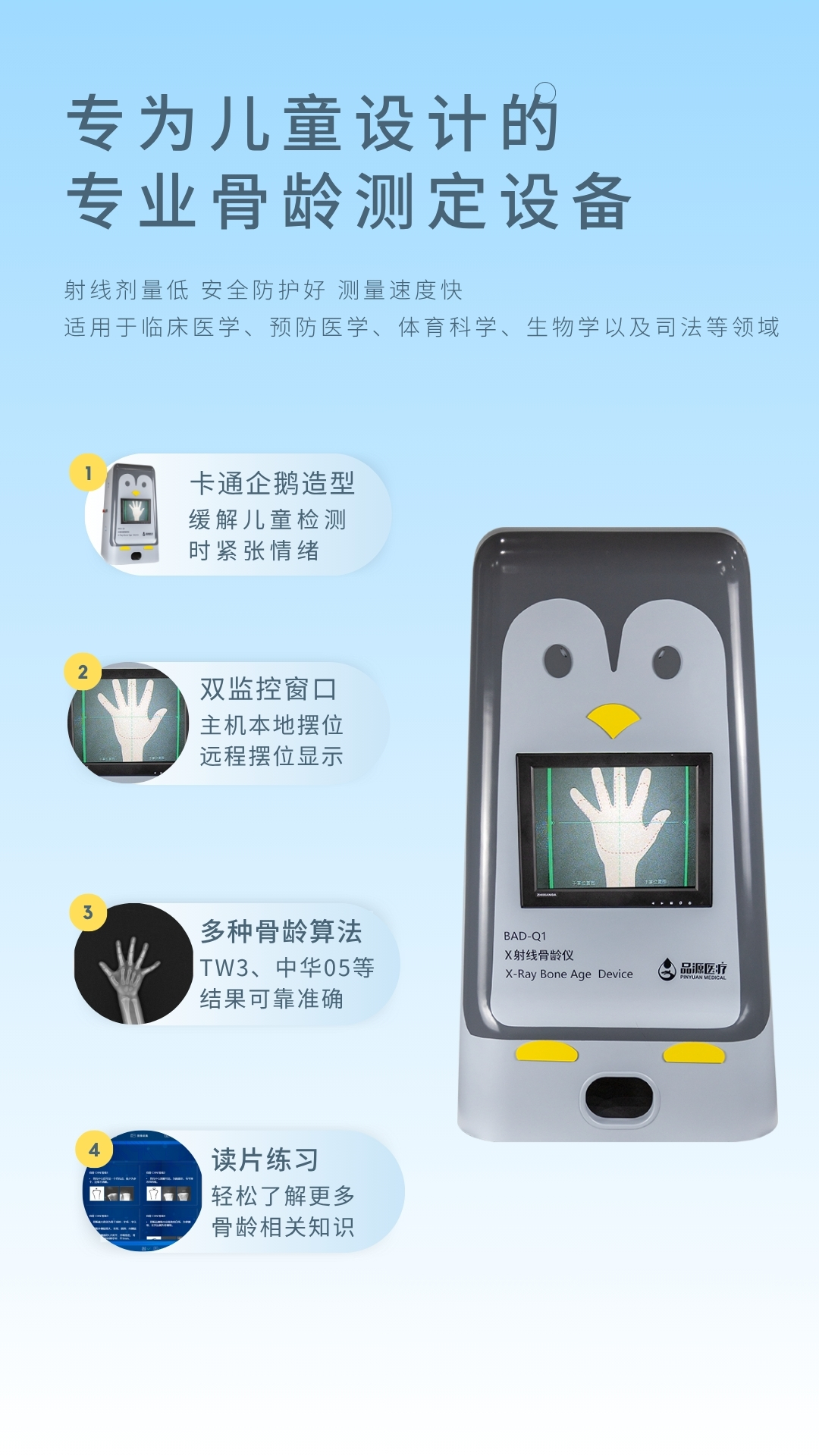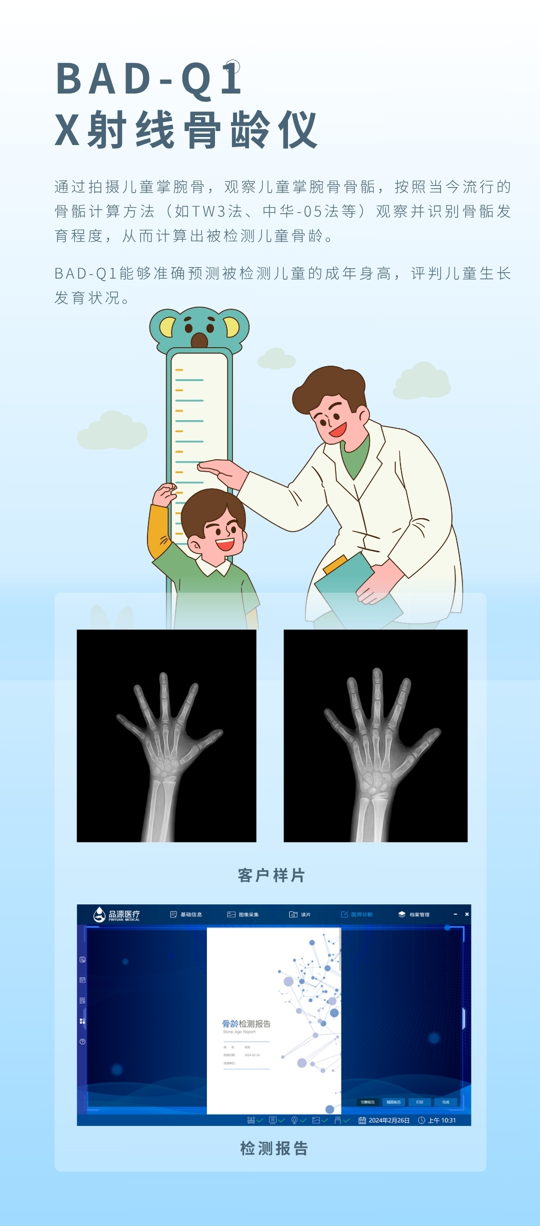產品適用兒童醫(yī)院、婦幼保健院、各級醫(yī)院的兒保科,體育研究機構,體育學校等,用于對青少年骨齡檢測與體格發(fā)育評價。